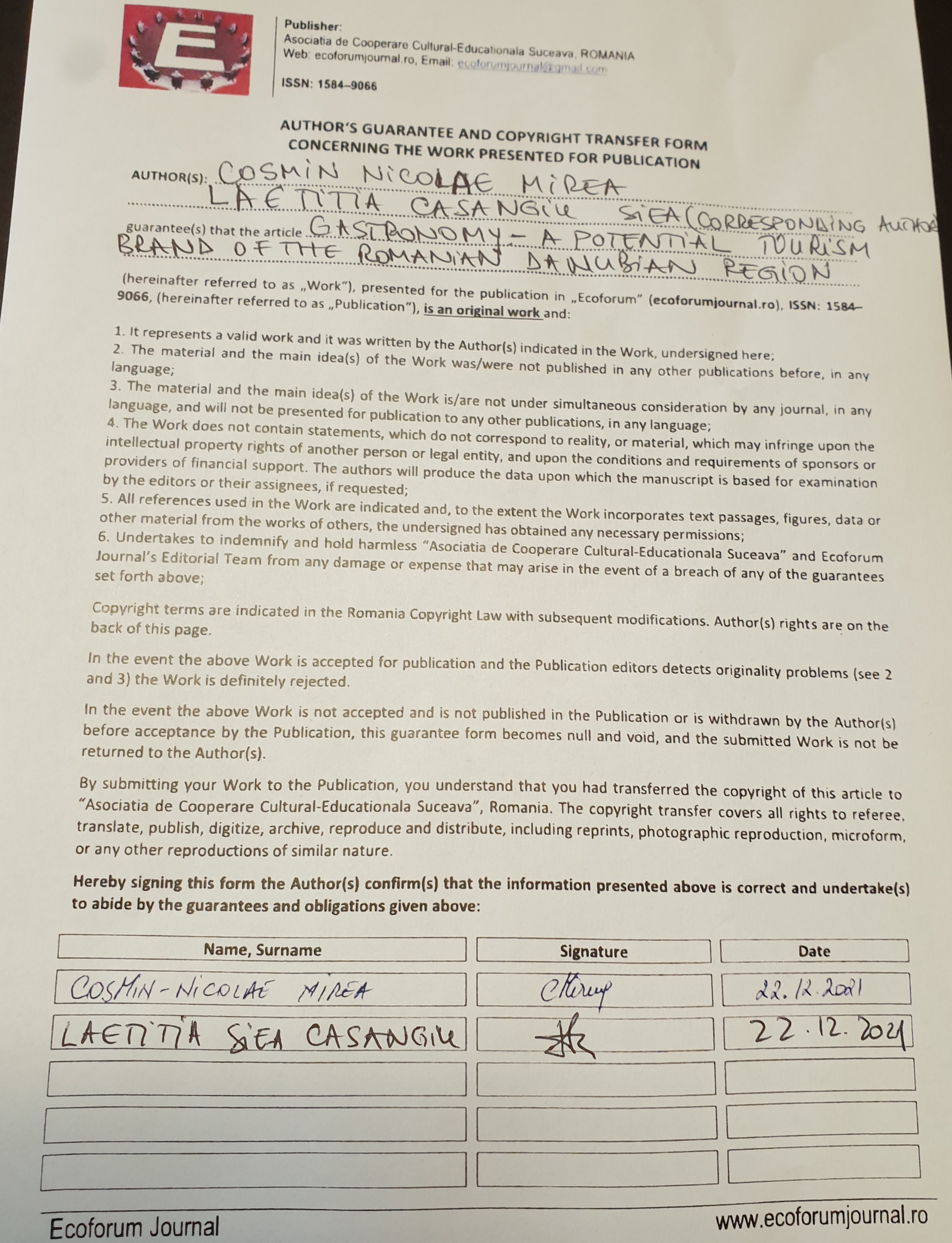 Mirea, C. N., & Casangiu Siea, L. (2022). GASTRONOMY – A POTENTIAL TOURISM BRAND OF THE ROMANIAN DANUBIAN REGION. Ecoforum Journal, 11(2). Retrieved from https://ecoforumjournal.ro/index.php/eco/article/view/1808