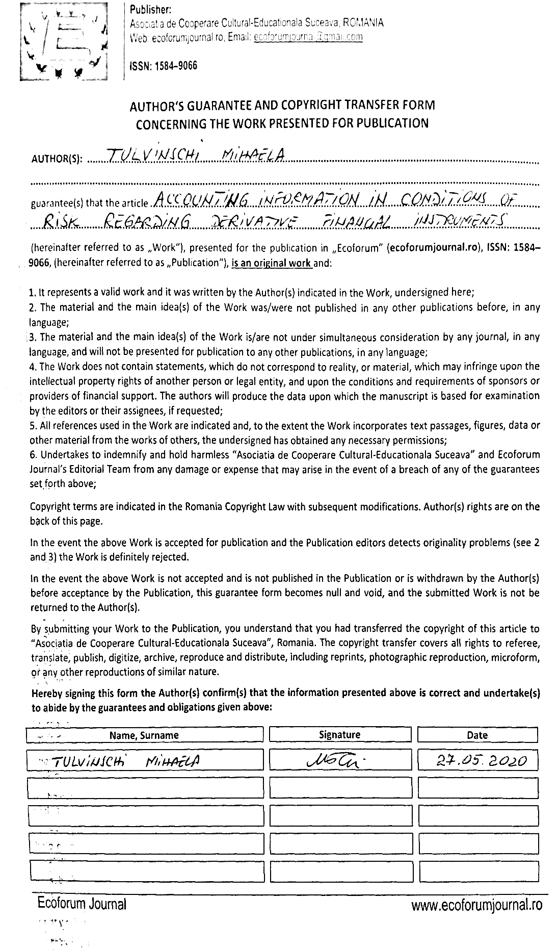 ACCOUNTING INFORMATION IN CONDITIONS OF RISK REGARDING FINANCIAL INSTRUMENTS