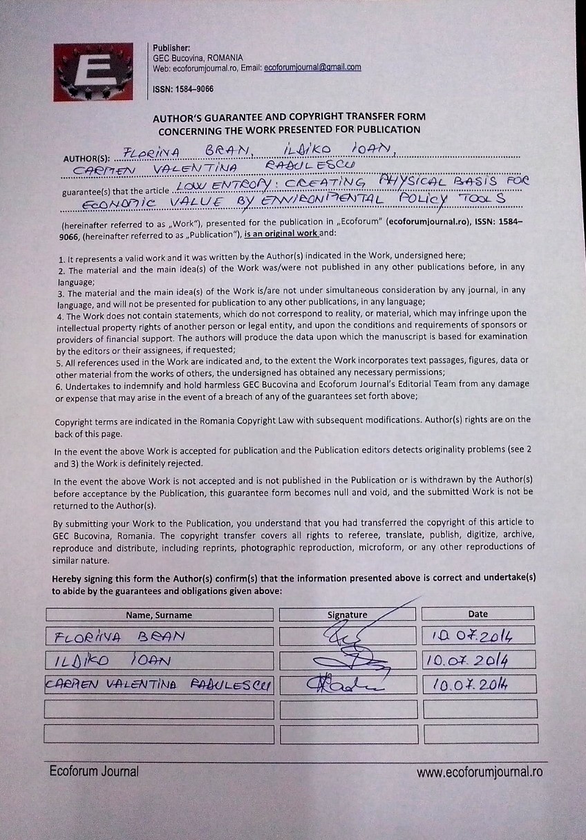 BRAN, F., IOAN, I., & RADULESCU, C. V. (2014). LOW ENTROPY: CREATING PHYSICAL BASIS FOR ECONOMIC VALUE BY ENVIRONMENTAL POLICY TOOLS. Ecoforum Journal, 3(2), 3. Retrieved from https://ecoforumjournal.ro/index.php/eco/article/view/2307