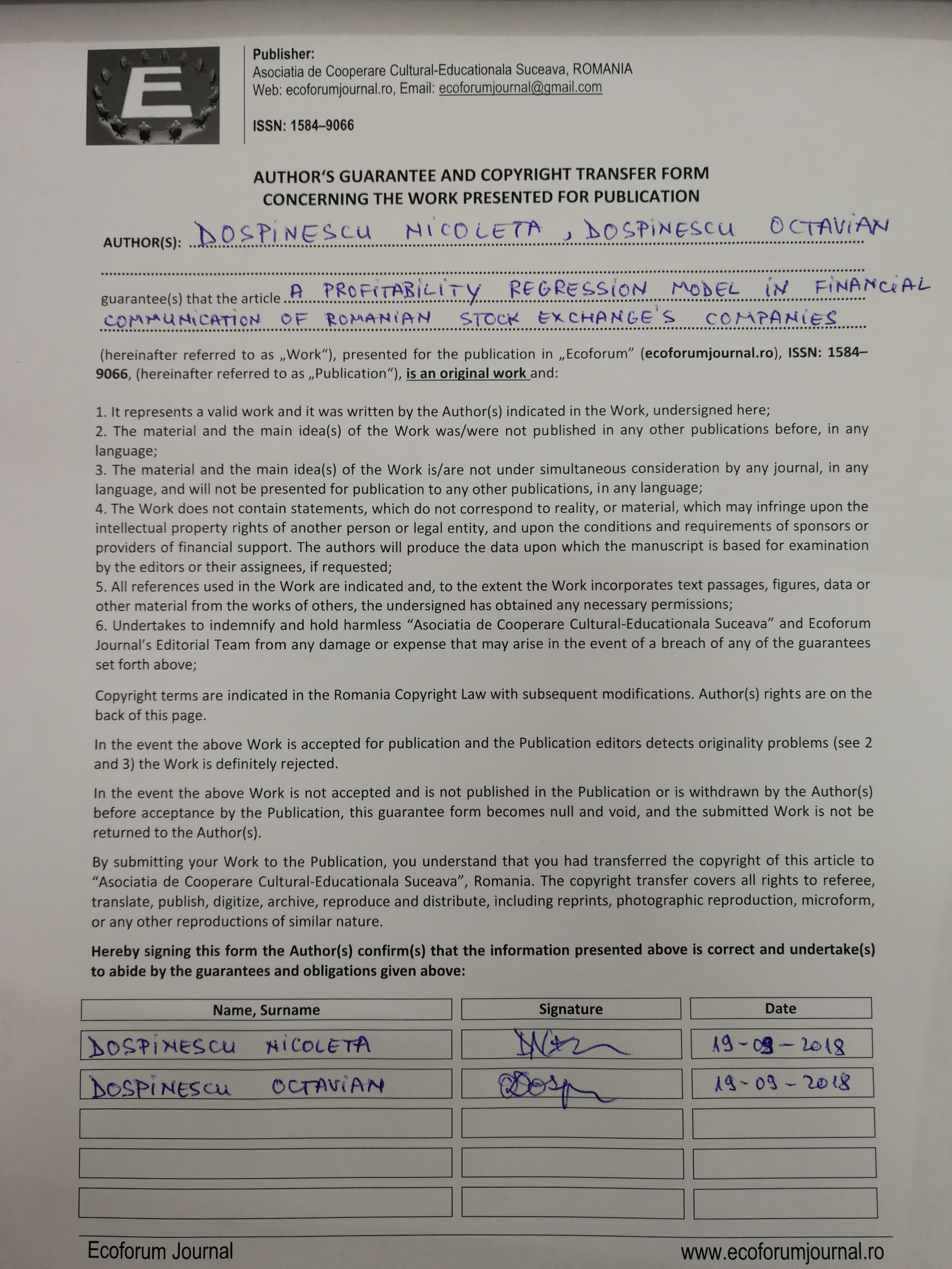 Dospinescu, N., & Dospinescu, O. (2019). A PROFITABILITY REGRESSION MODEL IN FINANCIAL COMMUNICATION OF ROMANIAN STOCK EXCHANGE’S COMPANIES. Ecoforum Journal, 8(1). Retrieved from https://ecoforumjournal.ro/index.php/eco/article/view/2485