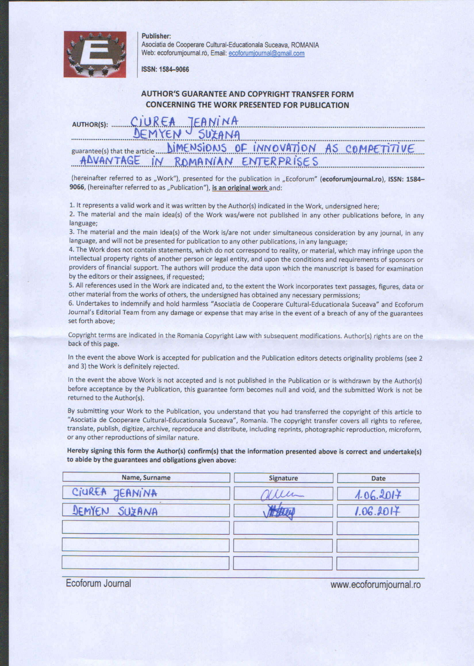 Ciurea; Demyen, J. S. (2017). DIMENSIONS OF INNOVATION AS COMPETITIVE ADVANTAGE IN ROMANIAN ENTERPRISES. Ecoforum Journal, 6(3). Retrieved from https://ecoforumjournal.ro/index.php/eco/article/view/2513